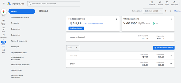 Se o valor não aparecer logo depois do pagamento, confira o status em payments.google.com e também na área de faturamento do próprio Google Ads.