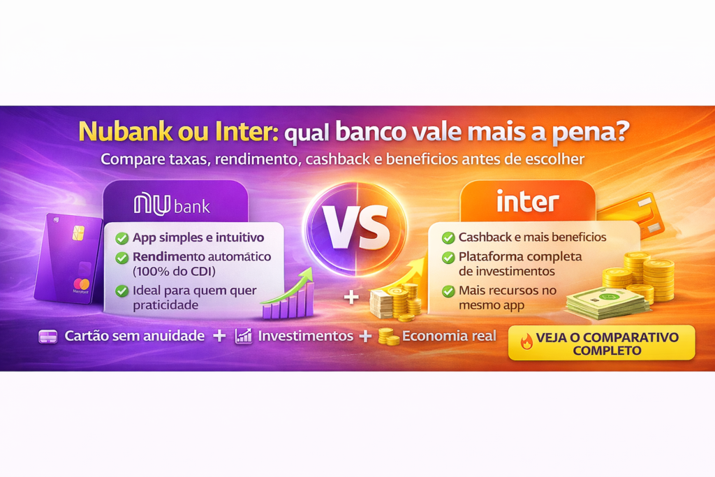 Se você chegou aqui pesquisando “nu bank ou inter”, “banco inter ou nu bank” ou “nu bank ou banco inter”, a resposta curta é esta: os dois são fortes, mas entregam propostas diferentes. O Nubank costuma vencer em simplicidade, experiência de app e proposta mais direta. O Inter costuma ganhar em ecossistema, cashback, variedade de serviços e conta internacional. Para muita gente, a escolha certa não é “qual é o melhor do mercado”, mas sim qual combina melhor com o seu perfil financeiro.